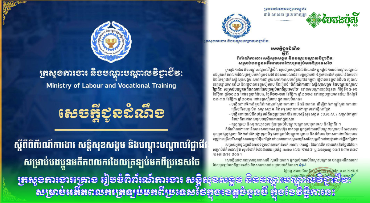 ក្រសួងការងារគ្រោង រៀបចំពិព័រណ៍ការងារ សន្តិសុខសង្គម និងបណ្ដុះបណ្តាលវិជ្ជាជីវៈ សម្រាប់អតីតពលករត្រឡប់មកពីប្រទេសថៃក្នុងខេត្តចំនួនបី ក្នុងខែវិច្ឆិកានេះ