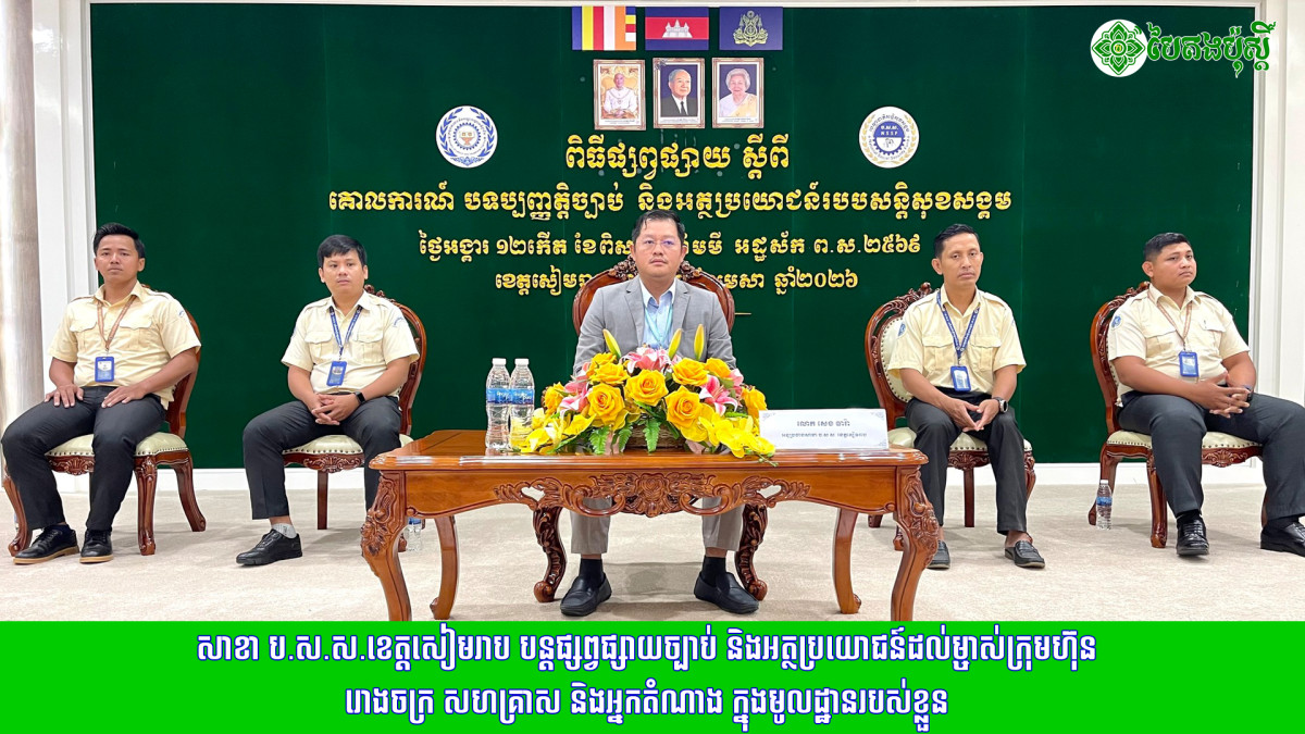 ដោយ៖ សំនៀង ក្រសួងការងារ និងបណ្តុះបណ្តាលវិជ្ជាជីវៈ រៀបចំពិធីផ្សព្វផ្សាយស្តីពី ភាពតានតឹងដោយកម្តៅ ការដុតកម្ទេចក្រណាត់ និងសុវត្ថិភាពអគ្គិភ័យ នៅតាមសហគ្រាស ក្រុមហ៊ុន រោងចក្រ ដោយមានការចូលរួមពីសំណាក់ លោកជំទាវ ជា សុខនី រដ្ឋលេខាធិការ តំណាងដ៏ខ្ពស់ខ្ពង់ឯកឧត្តម ហេង សួរ រដ្ឋមន្ត្រី ក្រសួងការងារ និងបណ្តុះបណ្តាលវិជ្ជាជីវៈ បានអញ្ជើញជាអធិបតី រួមជាមួយបុគ្គលិកទទួលបន្ទុកផ្នែករដ្ឋបាល ធនធានមនុស្ស គ្រូពេទ្យសហគ្រាស ក្រុមការងារសុវត្ថិភាពនិងសុខភាពការងារ និងតំណាងកម្មករនិយោជិត ប្រមាណជាង ៥០០នាក់។ តាមរយៈកម