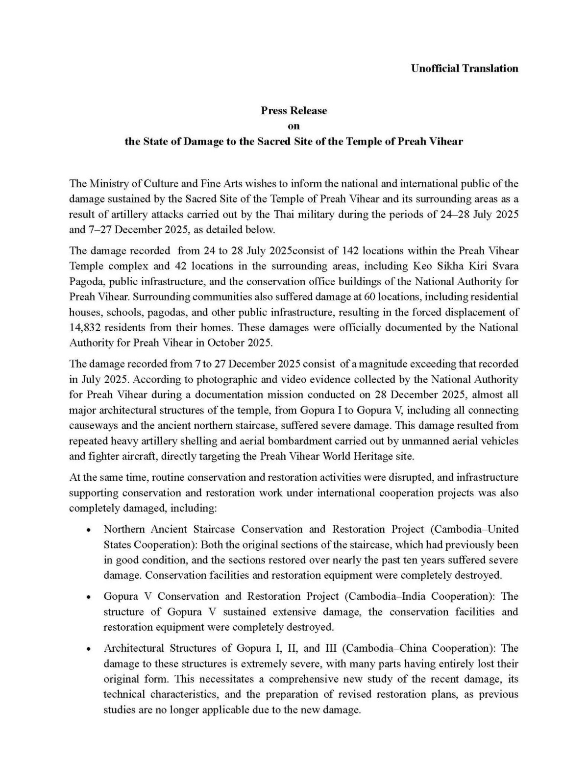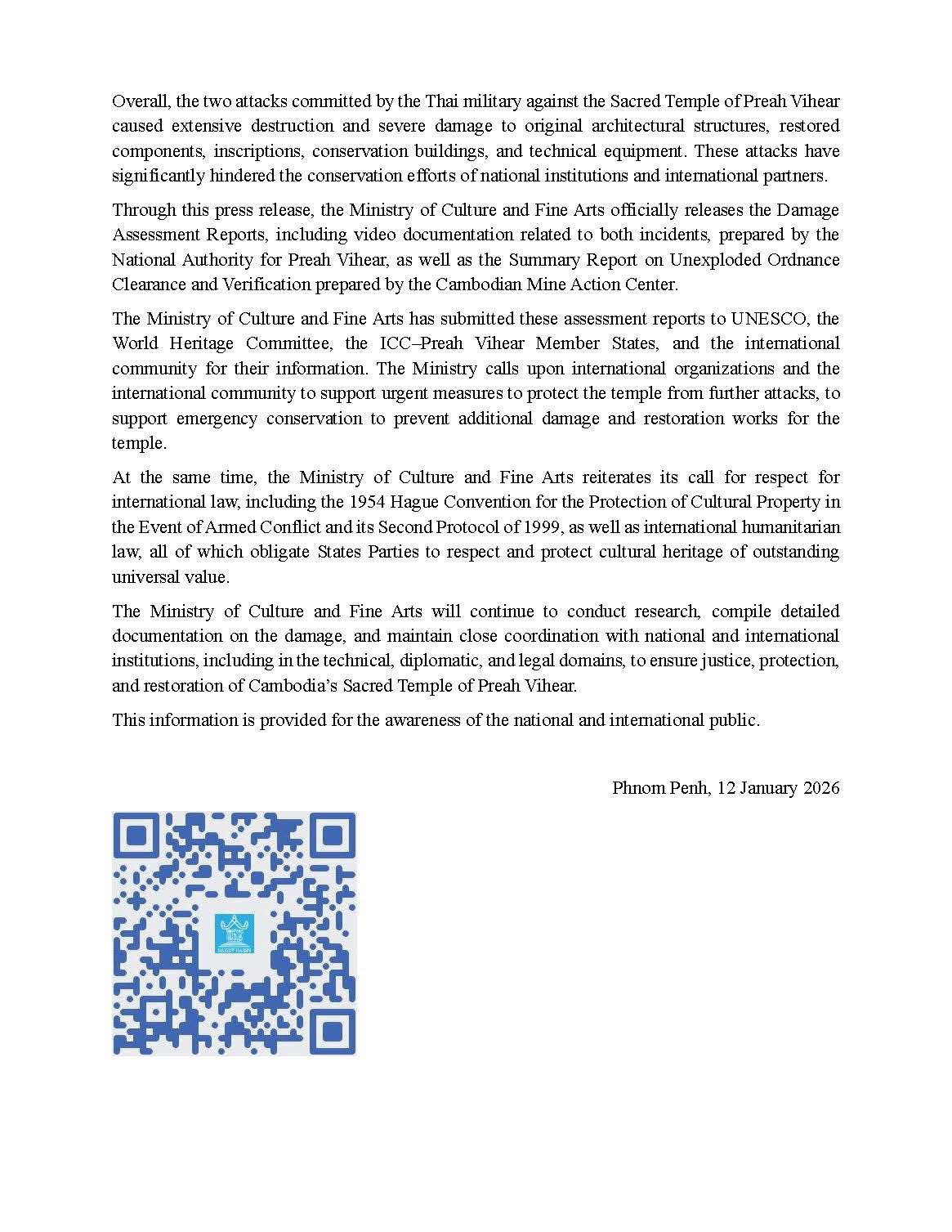 Phnom Penh, 12 January 2026 — Cambodia’s Ministry of Culture and Fine Arts has officially reported extensive damage to the Sacred Temple of Preah Vihear, a UNESCO World Heritage Site, following artillery and aerial attacks by the Thai military during two periods in July and December 2025.