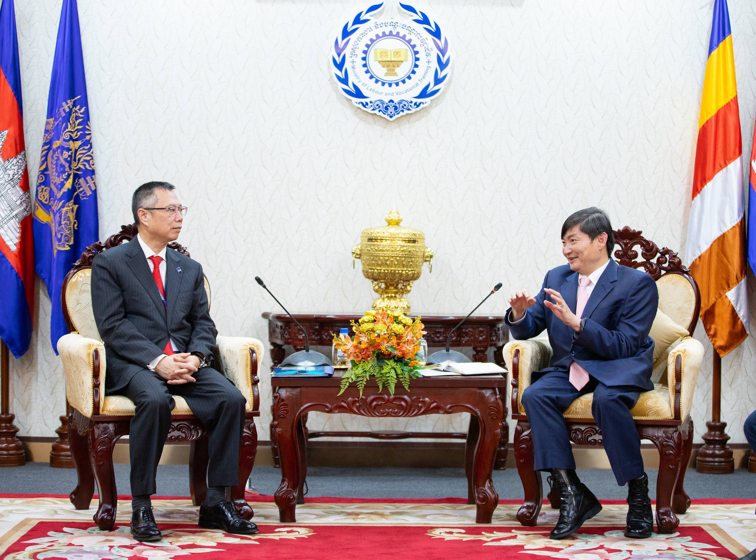 នាឱកាសទទួលជួបសម្ដែងការគួរសម និងពិភាក្សាការងារជាមួយលោក Nianshan Zhang អគ្គនាយកនៃនាយកដ្ឋានប្រចាំតំបន់អាស៊ីអាគ្នេយ៍នៃធនាគារអភិវឌ្ឍន៍អាស៊ី (ADB) នៅទីស្តីការក្រសួង ដើម្បីពិនិត្យមើលវឌ្ឍនភាព និងឱកាសសំខាន់ៗ ក្នុងការពង្រឹង និងពង្រីកកិច្ចសហការក្នុងវិស័យអប់រំបណ្តុះបណ្តាលបច្ចេកទេស និងវិជ្ជាជីវៈ (TVET) និងការអភិវឌ្ឍជំនាញនៅកម្ពុជា នារសៀលថ្ងៃទី២៥ ខែកុម្ភៈ ឆ្នាំ២០២៦ ឯកឧត្ដម ហេង សួរ រដ្ឋមន្ត្រីក្រសួងការងារ និងបណ្ដុះបណ្ដាលវិជ្ជាជីវៈ បានថ្លែងអំណរគុណ និងវាយតម្លៃខ្ពស់ចំពោះកិច្ចសហប្រតិបត្តិការយូរអង្វែងជាមួយ ADB ដែលសម្រេចបាននូវសមិទ្ធផលជាទីមោទន ក្នុងការគាំទ្រការអភិវឌ្ឍជំនាញកម្លាំងពលកម្ម និងពង្រឹងសមត្ថភាពប្រកួតប្រជែង ជាពិសេសក្នុងការធ្វើទំនើបកម្មប្រព័ន្ធ TVET។
