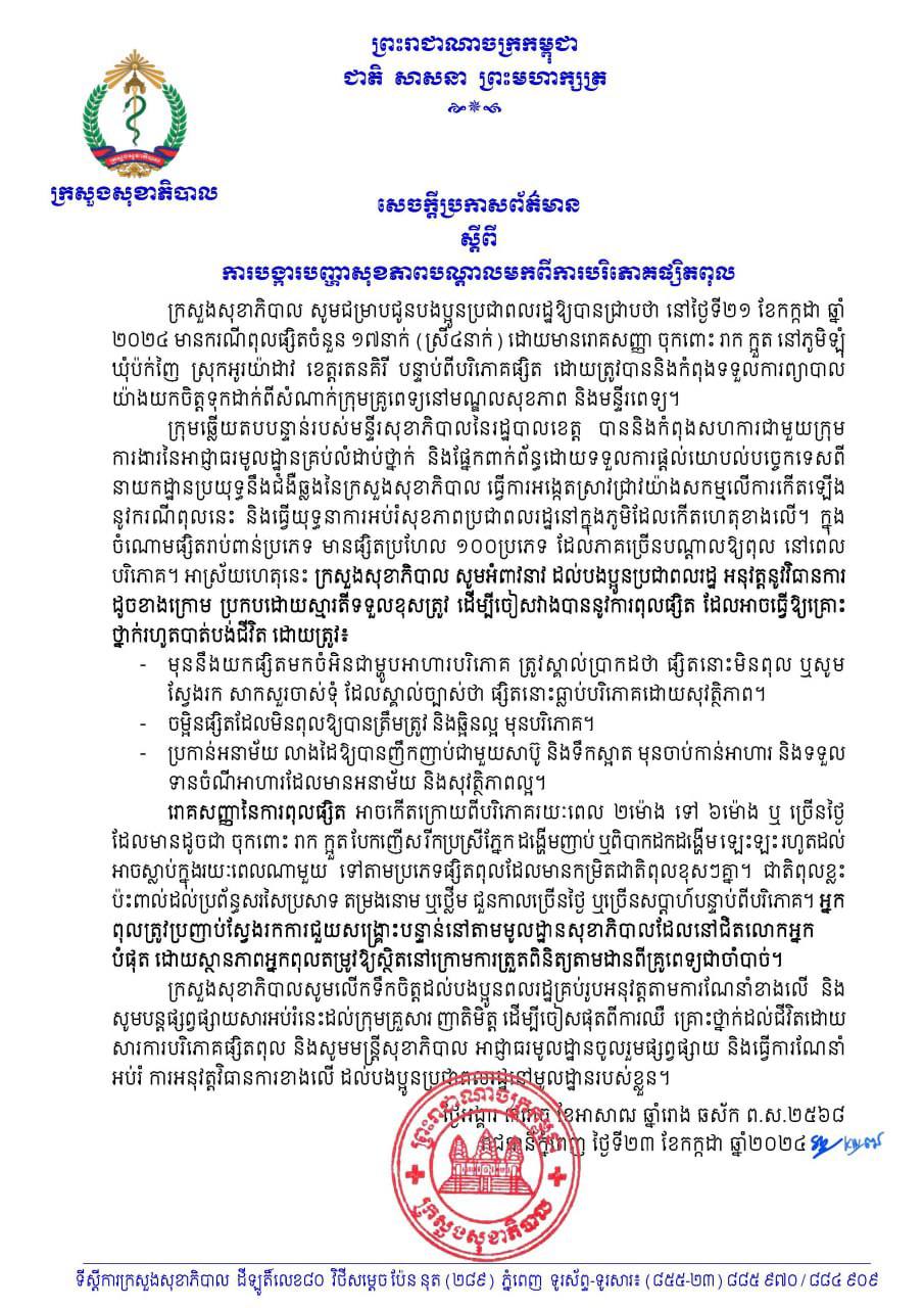 ទាក់ទងនឹងករណីនេះដែរ នៅថ្ងៃទី២៣ ខែកក្កដា ឆ្នាំ២០២៤នេះ ក្រសួងសុខាភិបាលបានចេញសេចក្ដីប្រកាសព័ត៌មាន និងសូមអំពាវនាវដល់បងប្អូនប្រជាពលរដ្ឋ អនុវត្តនូវវិធានការប្រកបដោយស្មារតីទទួលខុសត្រូវ ដើម្បីចៀសវាងបាននូវការពុលផ្សិត ដែលអាចធ្វើឱ្យគ្រោះថ្នាក់រហូតបាត់បង់ជីវិត ដោយមុននឹងយកផ្សិតមកចំអិនជាម្ហូបអាហារបរិភោគ ត្រូវស្គាល់ប្រាកដថាផ្សិតនោះមិនពុល ឬសូមស្វែងរកសាកសួរចាស់ទុំ ដែលស្គាល់ច្បាស់ថាផ្សិតនោះធ្លាប់បរិភោគដោយសុវត្ថិភាព។ ប្រកាន់អនាម័យ លាងដៃឱ្យបានញឹកញាប់ជាមួយសាប៊ូ និងទឹកស្អាត មុនចាប់កាន់អាហារ និងទទួល ទានចំណីអាហារដែលមានអនាម័យ និងសុវត្ថិភាពល្អ។