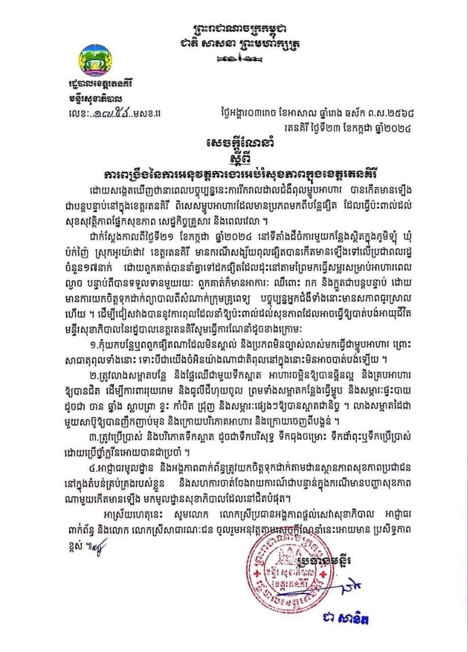 ដើម្បីជៀសវាងបាននូវការពុលដែលនាំឱ្យប៉ះពាល់ដល់សុខភាពដែលអាចធ្វើឱ្យបាត់បង់អាយុជីវិត មន្ទីរសុខាភិបាលនៃរដ្ឋបាលខេត្តរតនគិរី សូមធ្វើការណែនាំដូចខាងក្រោម៖