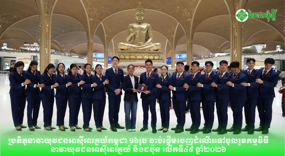 ប្រតិភូនាវាយុវជនអាស៊ីអាគ្នេយ៍កម្ពុជា ១៦រូប ចាប់ផ្តើមចេញដំណើរទៅចូលរួមកម្មវិធីនាវាយុវជនអាស៊ីអាគ្នេយ៍ និងជប៉ុន លើកទី៤៩ ឆ្នាំ២០២៦