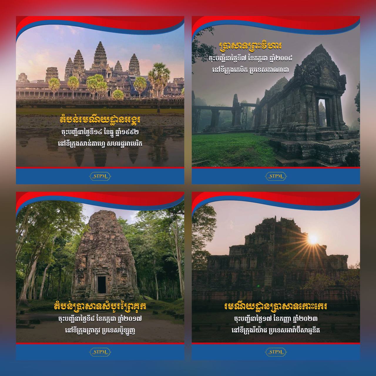 តំបន់ប្រាសាទសម្បូរព្រៃគុហ៍ បុរាណស្ថាននៃអតីតរាជធានីឦសានបុរី ស្ថិតនៅក្នុងខេត្តកំពង់ធំ ជាសម្បត្តិវប្បធម៌ត្រូវបានចុះបញ្ជីក្នុងបេតិកភណ្ឌភិភពលោកនៅថ្ងៃទី៨ ខែកក្កដា ឆ្នាំ២០១៧ ក្នុងសម័យប្រជុំគណៈកម្មាធិការបេតិកភណ្ឌពិភពលោកលើកទី៤១ នាទីក្រុងក្រាកូវ ប្រទេសប៉ូឡូញ។ ប្រាសាទកោះកេរ បុរាណស្ថាននៃអតីតរាជធានីលិង្គបុរី ឬឆោកគគ៌្យរ ស្ថិតនៅក្នុងខេត្តព្រះវិហារ ជាសម្បត្តិវប្បធម៌ត្រូវបានចុះបញ្ជីក្នុងបេតិកភណ្ឌភិភពលោកនៅថ្ងៃទី១៧ ខែកញ្ញា ឆ្នាំ២០២៣ សម័យប្រជុំគណៈកម្មាធិការបេតិកភណ្ឌពិភពលោកលើកទី៤៥ នាទីក្រុងរីយ៉ាដ រាជាណាចក្រអារ៉ាប៊ីសាអ៊ូឌីត។